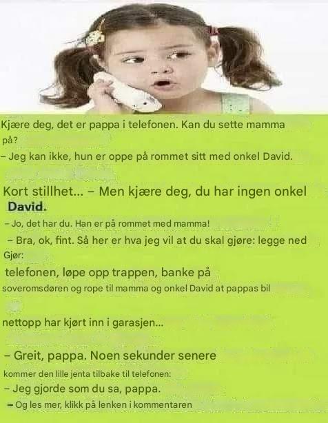 Etter noen sekunder svarte noen. Det var en liten jente. Faren spurte henne så: «Hallo kjære, det er pappa i telefonen ... Kan du sette mamma på?»