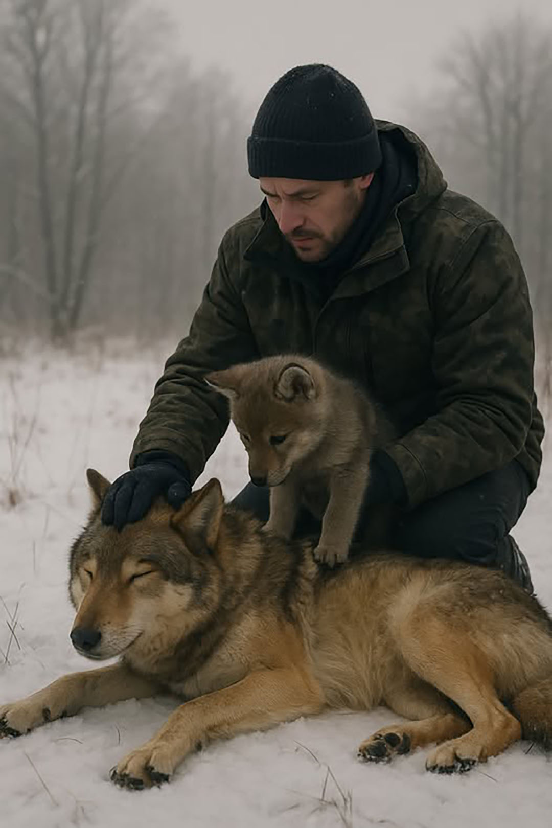 Det var mens han krysset et stort snødekt jorde at han oppdaget en ubevegelig, mørk skikkelse, halvt skjult av snøen. Hans første instinkt var å bevege seg unna. Likevel fanget noe ved scenen oppmerksomheten hans: en ung ulveunge sirklet rundt skikkelsen, ute av stand til å forstå hvorfor den ikke reiste seg.