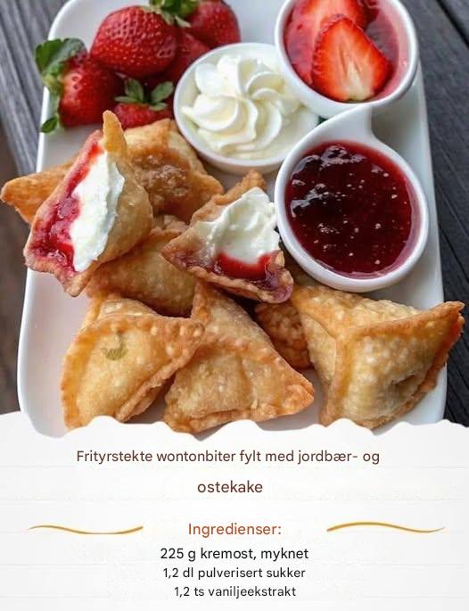 Lyst på en sprø, kremet dessert med en fruktig vri? Disse frityrstekte jordbærostekake-wontonbitene er den perfekte søtsaken. Fylt med rik kremost, friske jordbær og pakket inn i gyldne, sprø wontoner vendt i kanelsukker – hver bit er en herlig blanding av teksturer og smaker. Ideell til fester, dessertfat eller når du har lyst på noe deilig og gøy å spise!