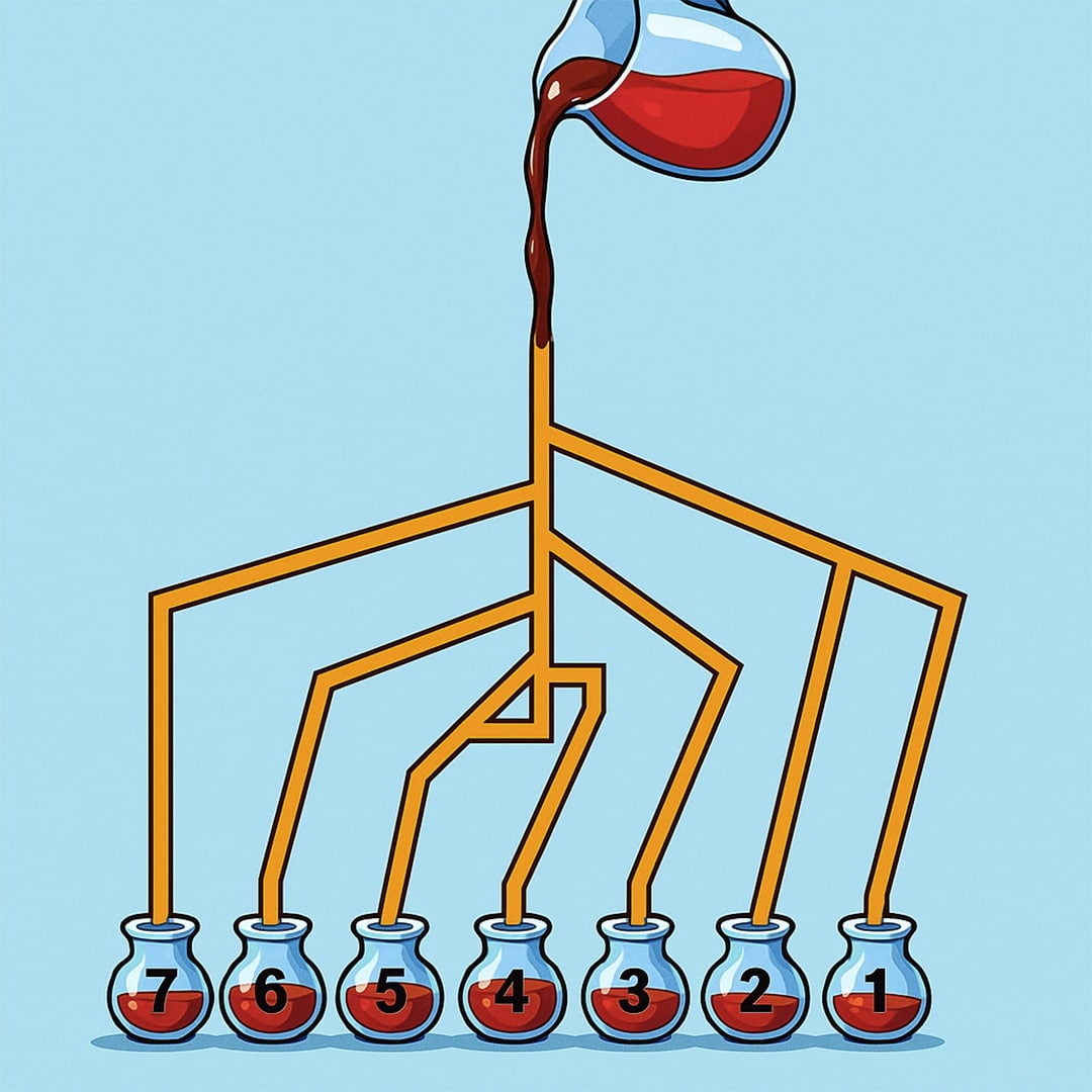 Her er scenariet: en åpen kran slipper ut vann gjennom et komplekst nettverk av rør som fører til sju beholdere . Ditt oppdrag? Bestem hvilken som fylles opp først .
