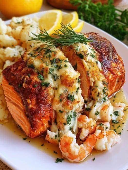 Denne retten kombinerer flakete, ovnsbakt laks med et kremet sjømatfyll for en restaurantverdig hovedrett som er overraskende enkel. Fyllet er forsiktig bundet slik at krabben holder seg i møre klumper og rekene gir et søtt bitt; en rask steking på høy varme avslutter fisken saftig med en lett bronsefarget topp.
