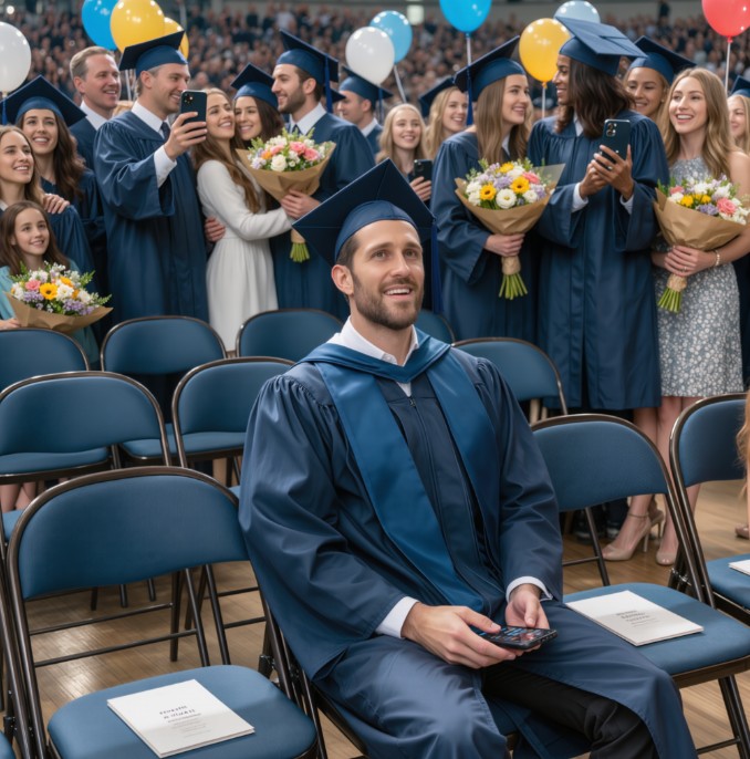 Det hjelper mer enn du tror, og det minner meg på at jeg ikke trenger å dele disse øyeblikkene alene. Jeg gikk av scenen med vitnemålet mitt i hånden og en tomhet i brystet, fordi alle setene var reservert for familien min, kona mi, barna mine. Foreldrene mine satt tomme under det skarpe lyset i auditoriet. Rundt meg gråt folk, klemte hverandre og ga blomster til lange køer av stolte familiemedlemmer. Jeg sto bare der alene og prøvde å bearbeide smerten og latet som jeg ikke brydde meg. Fem år med sene kveldstimer, tidlige morgenvakter og ofrede helger hadde brakt meg til dette øyeblikket.
