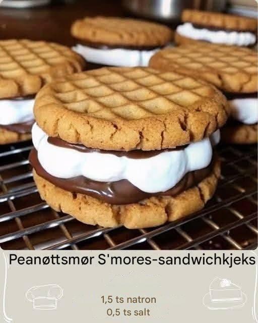 Ta med deg bålet inn med disse dekadente peanøttsmør-s'mores-sandwichkjeksene! Myke, seige peanøttsmørkjeks har et klissete marshmallowfyll med en nostalgisk vri – kremet peanøttsmør, søt vanilje og valgfrie grahamkjeks-smuler og sjokoladedryss for den klassiske s'mores-følelsen. Enten du lager disse til en spesiell anledning eller en koselig kveld hjemme, er de garantert en hit.