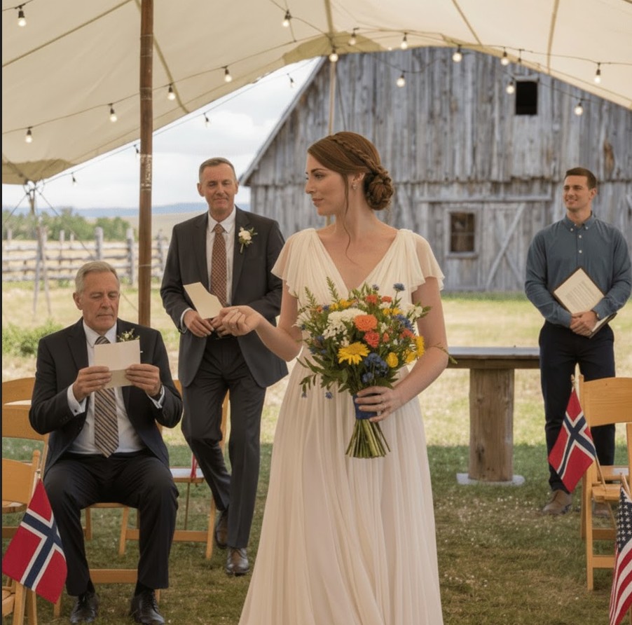 Under datterens bryllupsseremoni på ranchen vår i Colorado snakket forloveden hennes konstant om landet vårt som om det var det eneste han kunne se. Stående ved alteret under en blomsterbue, med fjellene i bakgrunnen og to hundre mennesker som holdt pusten, dro hun en brettet lapp fra buketten og presset den i hånden min. Tre ord stirret på meg, skrevet med hennes håndskrift: