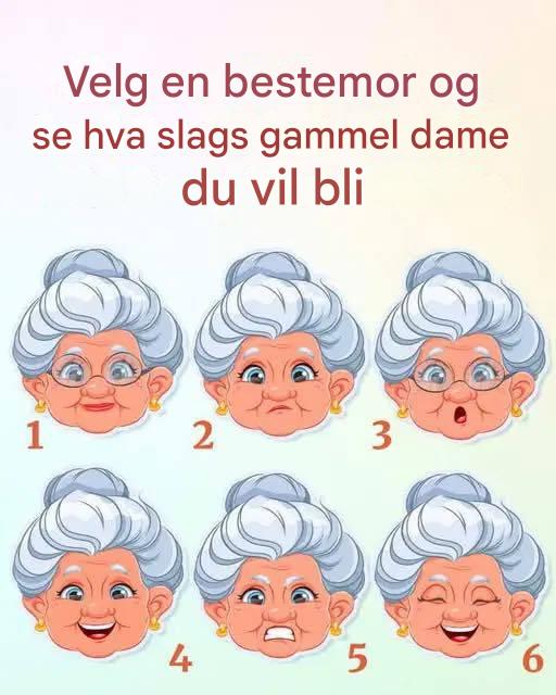 Aldring er en reise full av visdom, erfaringer og, la oss være ærlige – morsomme særegenheter. Enten vi liker det eller ikke, forvandler vi oss alle når vi blir eldre, og utvikler unike trekk som definerer våre gylne år. Dette lekne bildet utfordrer deg til å velge en bestemor og oppdage hva slags eldre kvinne du kan bli. Så, hvilken taler til ditt fremtidige jeg? La oss finne det ut!